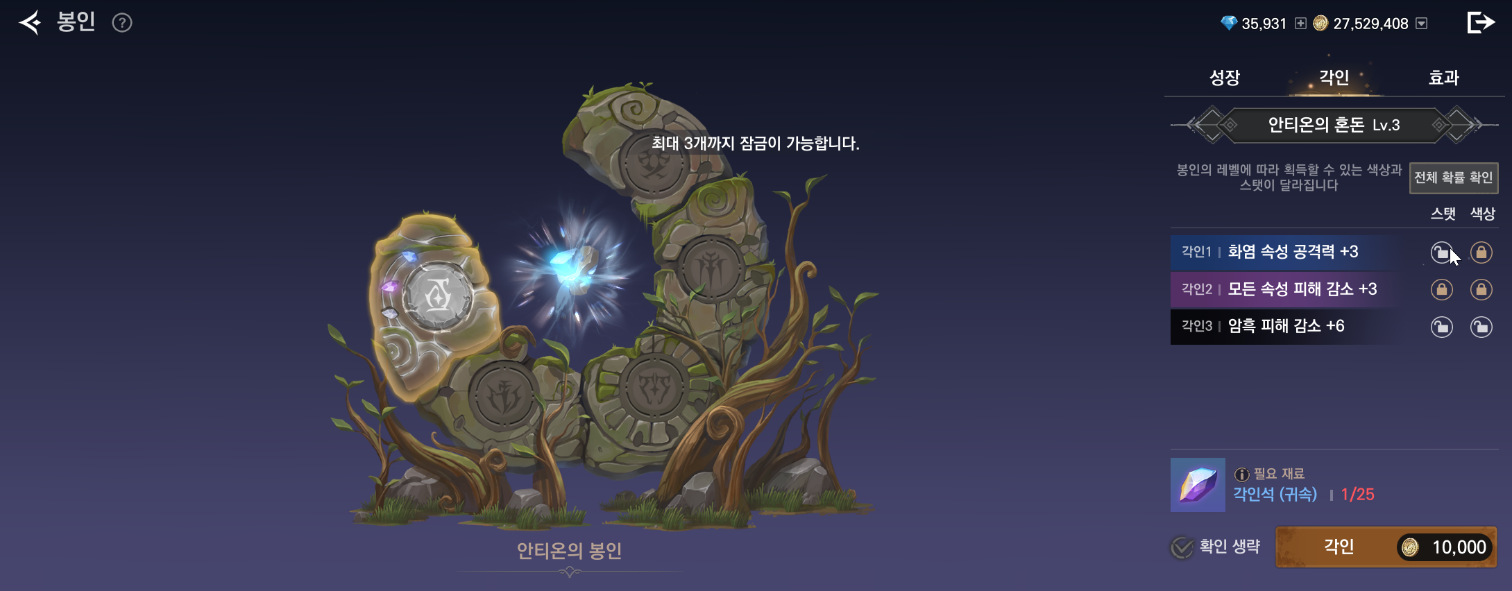 각인석의 수급량이 매우 적으니 스탯잠금은 신중하게 진행하세요