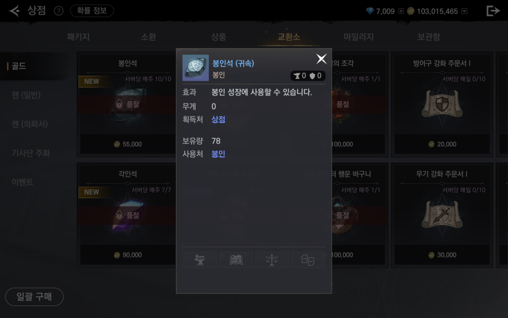 루트는 총 세 가지다. 첫 번째, 상점이다. '봉인석'과 '각인석' 모두 교환소→ 골드에서 매주 10개와 7개를 각 55,000골드와 90,000골드씩 구매할 수 있다. 즉, 한 주에 1,450,000 골드를 소비해야 하는 셈이다.