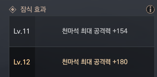공략쓰는 기준.. 천마석레벨이 낮은게 없어서 현재상태로 보여드립니다.