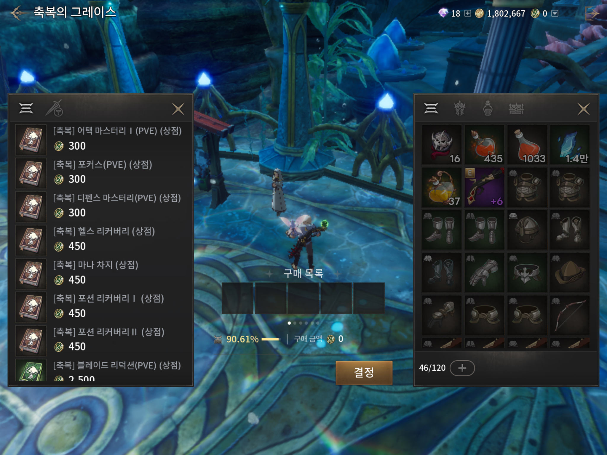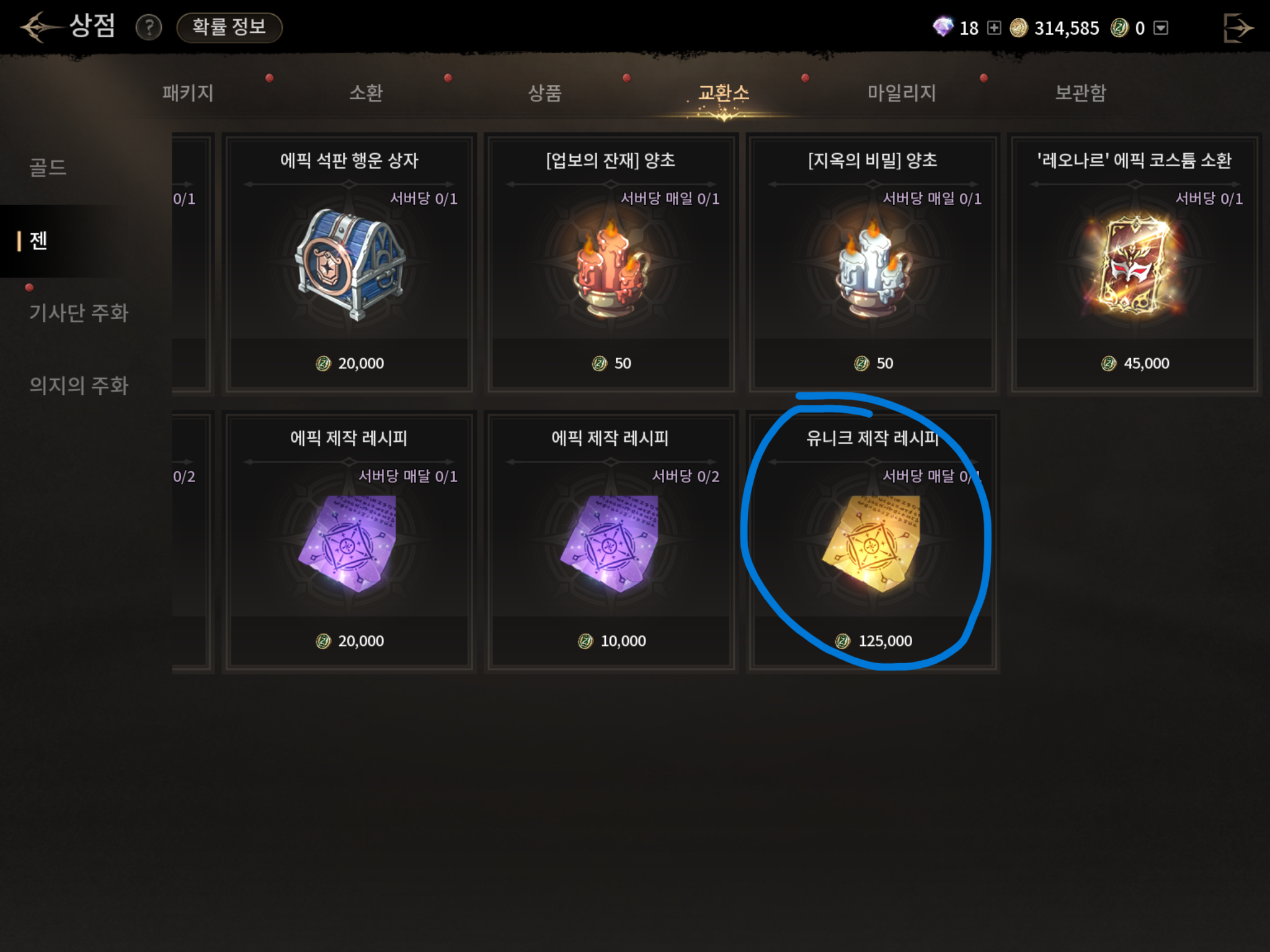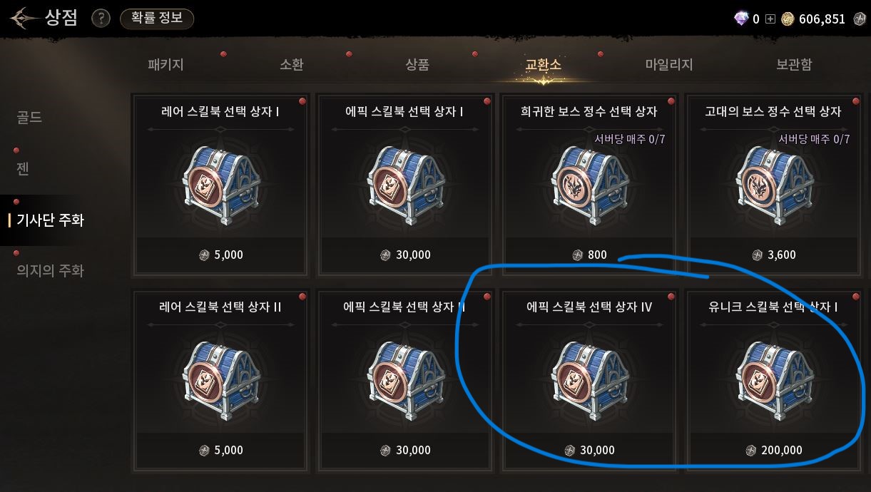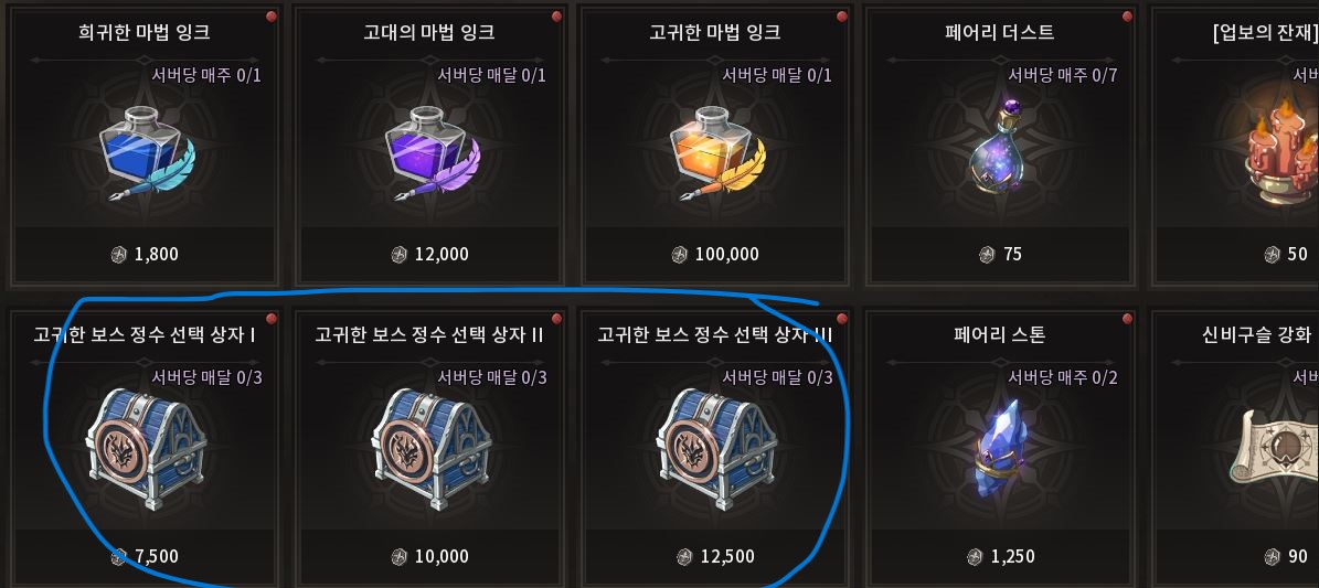 구매 이후에는 젠 상점에 파란색 친 스킬북 선택 상자,유니크 제작 레시피 등을 구매를 추천합니다.