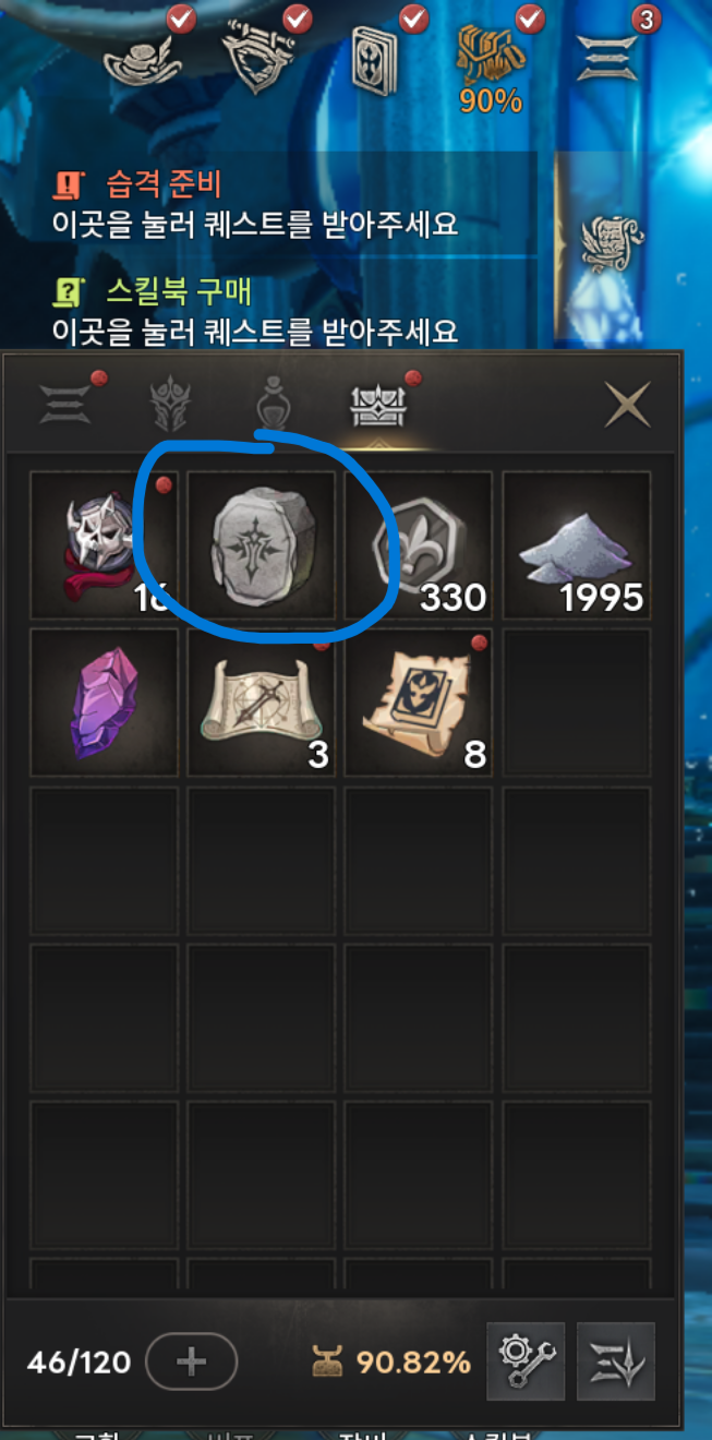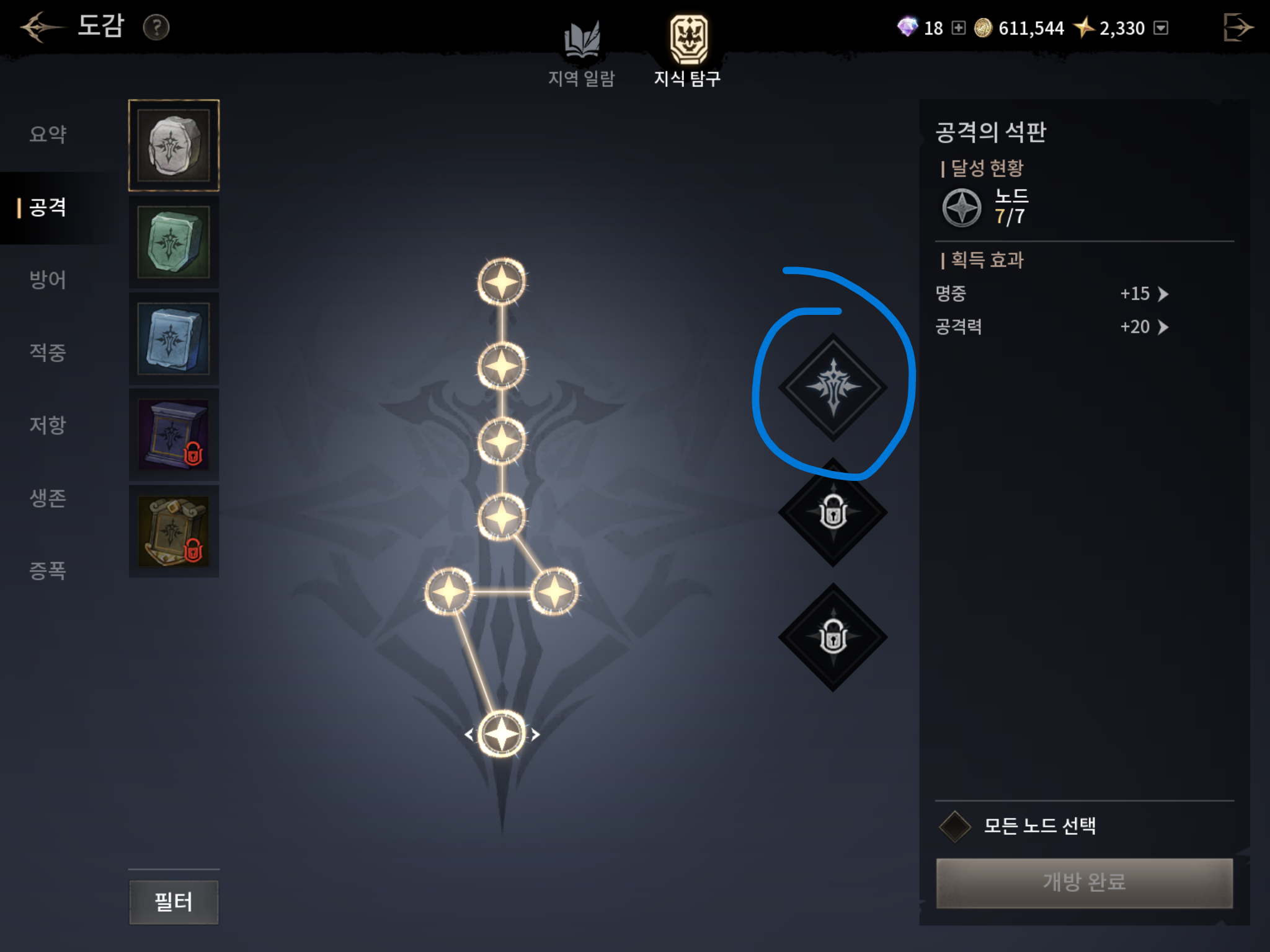파란색으로 동그라미 친 부분은 석판조각으로 능력치를 얻을 수 있는 부분입니다.