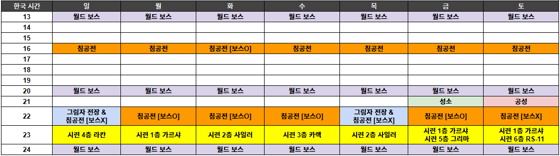● <그림자 전장> 은 플레이 타임이 짧은 반면 자리를 비우기는 애매하여 온전히 1시간을 투자해야 합니다. ● 때문에 전장 시간을 <보스가 없는 침공전> 시간으로 재배치하여 그림자 대기에 침공 정수 획득을 겸하는 방안을 검토 중에 있는 점 참고 부탁드립니다. ○ 일, 목요일 21시 그림자 전장 스케줄 삭제 ○ 일, 목요일 22시 ‘침공전(보스 미출현)’ / ‘그림자 전장’ 동시 진행 |