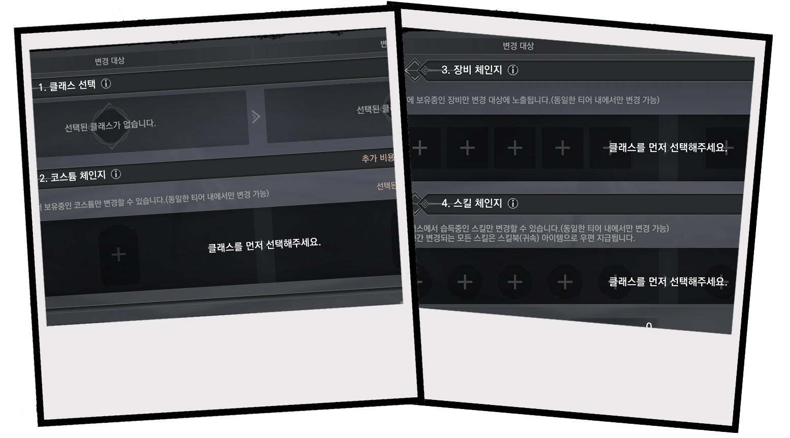 클래스 체인지에서 바꿀 수 있는 항목들은 코스튬, 장비, 스킬로 구성되어 있어요!