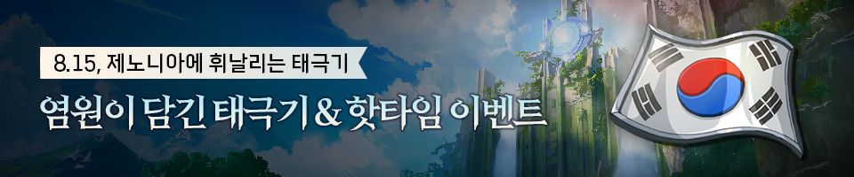 - 이벤트 기간 동안 제노니아 필드와 던전 전 지역에 광복절을 기념하여 경험치&골드 2배 증가 핫타임이 적용됩니다.