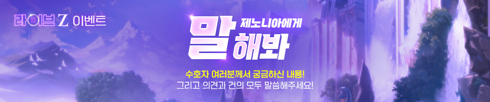 - 아래 설문 링크를 통해 수호자님께서 제노니아에 대해 궁금하신 점, 건의 사항 혹은 기타 의견 등을 라이브Z에 알려주세요!