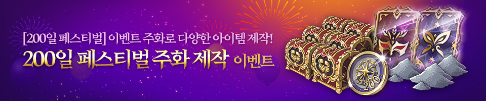 - '200일 페스티벌 주화'를 이용해 [제작] - [이벤트] - [200일 기념] - [페스티벌 주화] 에서 다양한 아이템으로 제작이 가능합니다.