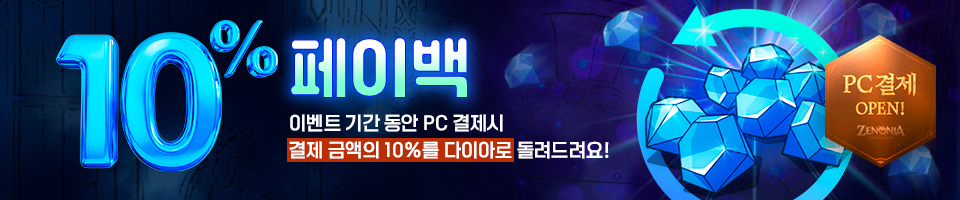 - 이벤트 기간 동안 PC버전 결제 시, 다이아 10% 페이백 이벤트가 진행됩니다.