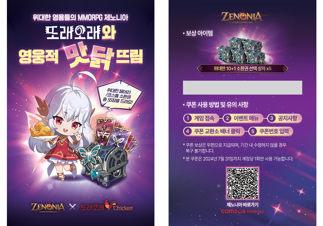 - - 또래오래에서 [제노니아의 위대한 보급세트] 제휴 메뉴를 주문 시, 특별 쿠폰 1개를 지급해 드립니다.